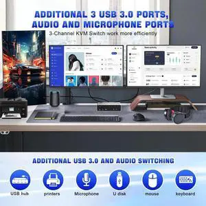 8K Displayport USB 3.0 KVM Switch 3 Monitors 4 Computers, DP+DP+DP Triple Monitor KVM Switch with Audio Microphone Output and 3 USB 3.0 Ports, 8K DP1.4 KVM Triple Monitor Keyboard Mouse Switcher