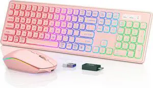 Wireless Keyboard and Mouse Combo - RGB Backlit, Rechargeable & Light Up Letters, Full-Size, Ergonomic Tilt Angle, Sleep Mode, 2.4GHz Quiet Mouse for Mac, Windows, Laptop, PC, Trueque (Pink)