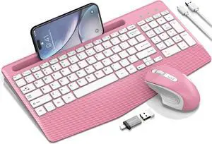 Wireless Keyboard and Mouse Combo, Ergonomic Keyboard with Wrist Rest, Phone Holder, Sleep Mode, 2.4G Lag-Free Rechargeable Compact Silent Cordless Keyboard Mouse for Windows, Mac, Laptop, PC (Pink)