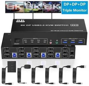 8K Displayport USB 3.0 KVM Switch 3 Monitors 4 Computers, DP+DP+DP Triple Monitor KVM Switch with Audio Microphone Output and 3 USB 3.0 Ports, 8K DP1.4 KVM Triple Monitor Keyboard Mouse Switcher