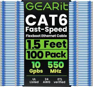 GEARit Cat 6 Ethernet Cable (100-Pack 2 Feet) Cat6 Network Patch, 10Gbps, RJ45, Snagless Cord, Gold-Plated Connectors, Internet for PC, TV, Tablet, Router, Printer, Servers, IT Data Center - Black