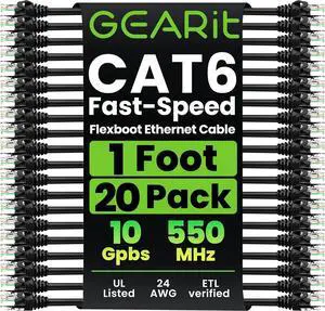 GearIT 20-Pack Cat6 Patch Cable 1 Foot Cat 6 Ethernet Cable Snagless Flexible Soft Tab - Preimum Series - Black