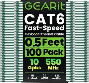 GEARit 100-Pack Cat6 Patch Cable 0.5ft Foot Cat 6 Ethernet Cable Snagless Flexible Soft Tab - Premium Series - Green