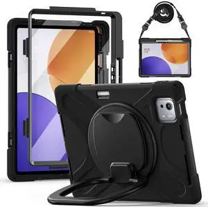 Protective Case for Samsung Galaxy Tab S9 Plus 2023 / S8 Plus 2022 / S7 FE 2021 / S7 Plus 2020 12.4 inch Tablet Shockproof Cover with 360 Degree Rotating Kickstand, Hand/Shoulder Strap Black
