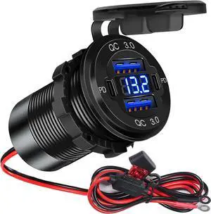 Qvfvfv 4 Port 12V USB Outlet Aluminum 78W Dual PD & QC Multi Port USB C Car Charger with Voltmeter, Cigarette Lighter Replacement 12 Volt USB Socket for Marine Boat Motorcycle RV Truck Golf Cart