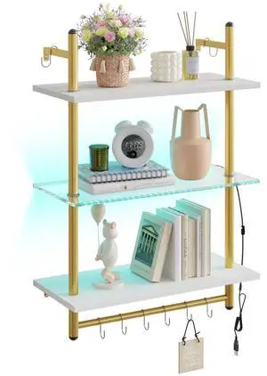 Bestier 23" Floating Shelves For Wall With Led Light 3-tier Wall-mounted Wood Shelves With 8 S-hooks