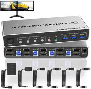 USB 3.0 Dual Monitor HDMI KVM Switch for 4 PCs, Supports EDID, 4K 60Hz KVM Switch 2 Monitors 4 Computers, with Audio Microphone Output and 3 USB 3.0 Ports, PC Monitor Keyboard Mouse Switcher for4 PC