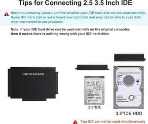 • Specifications: This converter can support up to three drives simultaneously; Supported Drives: 2.5"/3.5" SATA HDD/SSD; 2.5"/3.5" IDE HDD; DVD-ROM, CD-ROM, CD-RW, DVD-RW, DVD+RW; Compatible Systems: Windows8/7/10/Vista/XP/Mac OS 9/10/Linux; Supports drives with a capacity of up to 6 TB; Support speed up to 5Gbps; Backward compatible with USB 2.0/1.1; On/Off Switch for HDD protection; DC Power Supply 12V for 3.5" devices; LED activity indicator, Plug & Play, simple, reliable and stable