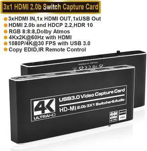 Feature: 4K HDMI Game Capture Card : Game video capture card is designed with high-end smart chip, stylish and compact by decent Aluminum Alloy shell. Supports up to 4K@60fps HDMI input, plug and play let the device work instantly with stream media like OBS/Xsplit. Ideal for live streaming, gaming broadcast, video recording, conference rooms, etc.