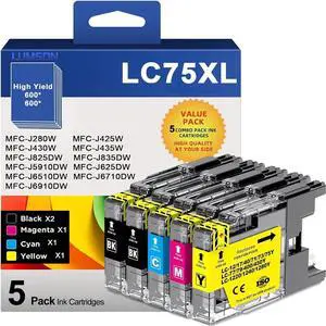 LC75 High Yield Ink Cartridge Replacement for Brother LC75 LC71 LC79 XL Use with MFC-J6510DW MFC-J6710DW MFC-J6910DW MFC-J280W MFC-J425W (2 Black, Cyan, Magenta, Yellow) 5 Pack
