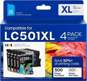 Compatible with LC501XL High Yield Ink Cartridges Compatible for Brother LC501 XL Work for Brother MFC-J1360DW, MFC-J1410DW, MFC-J1260DW Printer (4 Pack, Black Cyan Magenta Yellow)