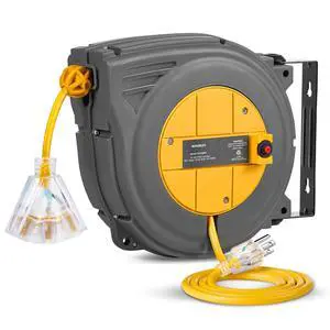 30 FT Retractable Extension Cord Reel, 16AWG/3C SJTW Power Cord Reel, 3 Electrical Outlets Triple Tap, 10A Circuit Breaker, Wall Mount/Ceiling Hanging for Workshop, Garage, ETL Listed