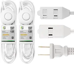 EP 2 Pack 15 ft Extension Cord with Foot Switch, ON/Off Switch Power Cord, 2-Prong 3 Electrical Power Outlets, 16/2C, White