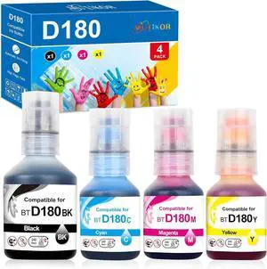 D180 Ink Refill Bottles Value Pack Replacement for Brother D180 BTD180BK BTD180CLVAL Ink Bottles for Brother DCP-T580DW DCP-T583DW DCP-T780DW Printers 4 Pack (Black Cyan Magenta Yellow)