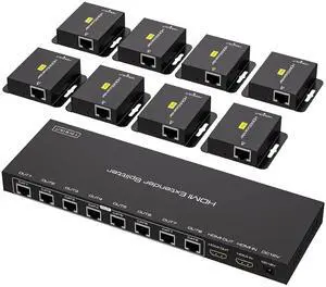 HDMI Extender Splitter Over Ethernet 1 in 8 Out Cat5e 6 up to 165ft 50m HD1080P 60Hz 3D with Port Loop Out Support EDID POC Suitable for Projection Exhibition Presentations