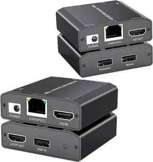HDMI USB KVM Extender Over Cat 6/7 1080P@60Hz KVM Extender 150M/492FT HDMI Over Ethernet Transmitter Receiver Support Keyboard Mouse,No Latency POC Function Single Power Supply