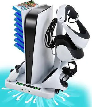 Magnetic Charging Station Dock for Controllers of PSVR 2 & PS5, Storage Stand for PS5 Console with Dual Cooling Fan, Silicone Lens Protective Cover, Mount Holder for PS VR2 Headset and Game Slot