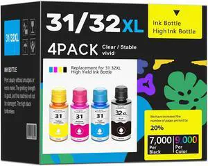 31 32XL Ink Bottle 4 Pack Work for Smart Tank 5101 5102 6001 7001 7002 7301 7602 Plus 651 551 Ink Tank Printer Replacement for HP 31 32XL (4 Combo Pack, 1 B, 1 C, 1 M, 1 Y)