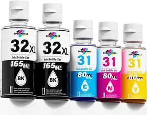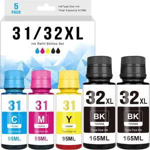 32 XL Black Ink Bottle 31 Ink Bottle Set Compatible with HP SmartTank 6001 7602 5101 7301 5000 5103 7001 Ink Refill for Smart Tank Plus 651 551 Printer (5 Pack, 165 ML 32XL Black Ink 100ML 31 CMY)