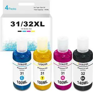 Ankink 31 32XL Compatible Ink Refill Bottle Set Replacement for HP Smart Tank 5000 5101 6001 7301 7602,Plus 651 551 555 450 455 457 Printer,4 Pack(Black,Cyan,Magenta,Yellow)