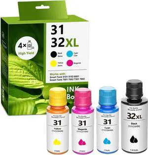 32XL/31 Black Cyan Yellow Magenta High Yield Ink Refills 4/Pack - 1VV24AN 1VU26AN 1VU27AN 1VU28AN Replacement for HP 31 32XL for Smart Tank 5101 5102 6001 7001 7002 7301 7602 Plus 651 551 Ink Tank