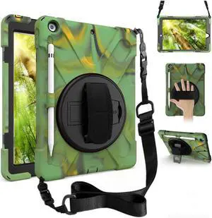 iPad 9th Generation Case, iPad 8th/7th Generation 10.2 Case with Pencil Holder Kickstand Hand Strap and Shoulder Strap Rugged Case for iPad 10.2 inch 2021/2020/2019, Camouflage