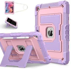 for iPad 9th 8th 7th Generation Case, iPad Case 10.2 with Screen Protector/Pencil Holder/Rotating Hand Strap Stand, Heavy Duty Protective iPad 9/8/7 Case Cover 2021/2020/2019, Pink
