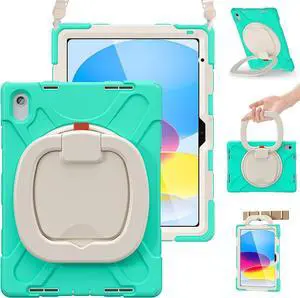 New iPad 10th Generation Case 2022 Release 10.9 Inch A2696 A2757 A2777-Shockproof Silicone Cover with Screen Protector/Pencil Holder/Rotating Handle Grip/Kickstand/Shoulder Strap, Mint Green