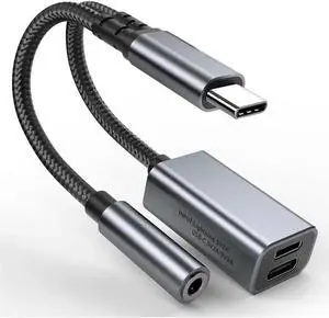USB C to 3.5mm Headphone and Charger Adapter 2-in-1 USB Type C to Aux Audio Splitter Jack with PD 60W Fast Charging Compatible with Samsung S22/S21/S20 Note20/10 Pixel 6/5/4 iPad Pro Air -Grey