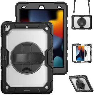 Case for iPad 9th/ 8th/ 7th Generation 10.2'', Shockproof with Screen Protector, Pencil Holder [360° Rotating Hand Strap] & Stand, for iPad 10.2 inch 2021-2019 (Clear)