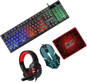 jojofuny Keyboard and Mouse Combo Ergonomic Backlit Keyboards Wired Mouse and Headset for Home Office Gaming