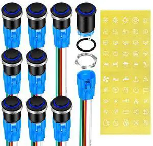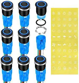 DaierTek Waterproof Latching Push Button Switch 12V 19mm ON Off Black Metal Pre-Wired 12 Volt Blue Led Light Illuminated for Marine RV -8 Pack
