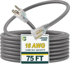 EP 75 Ft 16/3 SJEOW Heavy Duty Extension Cord, Grey Power Cable with LED Lighted Plug & 3-Prong Grounded Plug, Water-Resistant for Indoor/Outdoor Use, Lawn, Garden, Appliances & Tools