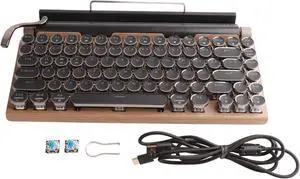 PUSOKEI Retro Typewriter Keyboard, Wire Less Mechanical Gaming Keyboard, 83 Keys BT Punk Backlit Keyboard with Blue Switch, Metal Round KeyCap, for PC Laptop Phone (Wood Grain Color)