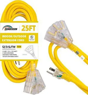 3-Outlets Indoor Outdoor Extension Cord Weatherproof with Lighted End, UL Listed, 12 Gauge 25FT Yellow 3 Prong Heavy Duty Extension Cord Multiple Outlets, 12/3 SJTW 15A Extension Cord