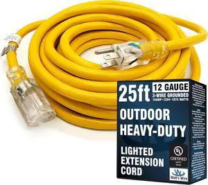 25 ft - 12 Gauge Heavy Duty Extension Cord - Lighted SJTW - Indoor/Outdoor Extension Cord by Watt's Wire - 25' 12-Gauge Grounded 15 Amp Extension Cord