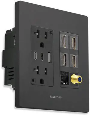 Premium Media Outlet Wall Plate - 6.3A USB Wall Outlet 2 USB A 2.0 + 1 USB C 3.0, 20A Dual Power Outlet, 4 HDMI Keystone Jack, Coaxial + Cat6 Rj45 Ethernet Outlet - Black Dual Gang Face Plate