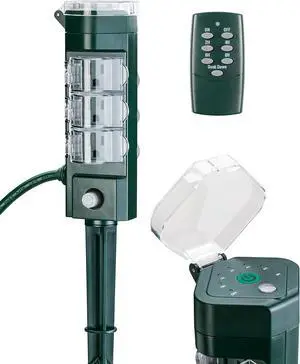 HBN Outdoor Power Strip With Photocell and Remote Control, Yard Stake Timer (2, 4, 6, 8 Hour), Weatherproof Outside Lights Dusk to Dawn for Christmas Lights, 6 Outlets, 6ft Cord