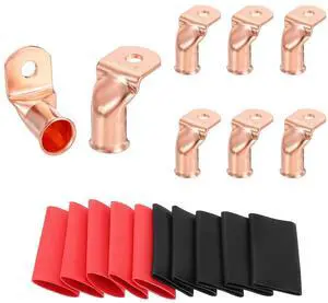 MECCANIXITY 8pcs 4/0 Awg 90° Bent Copper Lugs Battery Cable Ends, 4/0 Gauge 5/16" Stud Battery Lugs Ring Terminal Connectors with 8pcs 3:1 Black & Red Heat Shrink Tubing