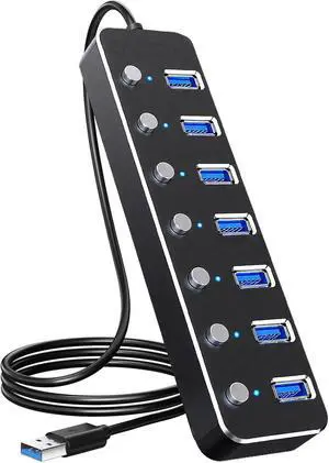 USB 3.0 Hub 7 Port USB Hub with 2ft Long Cable Aluminum USB Hub for Laptop and PC with Individual On/Off Switch and LED Indicator