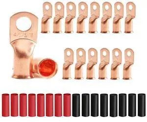 16Pcs 4/0 AWG 5/16" Stud Heavy Duty Copper Wire Lugs with 16Pcs Heat Shrink Tubing 4/0 Gauge Copper Ring Terminals Battery Cable Ends Bare Copper Eyelets Tubular Ring Terminal for Car Boat Marine