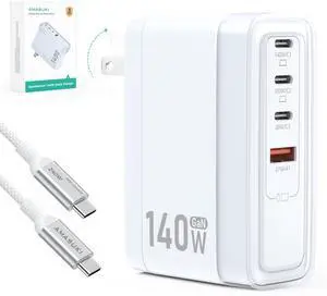 140W MAX USB C Charger,4-Port Fast Charging Block PD3.1 GaN Travel Essentials Laptop Charger for Apple MacBook Air/Pro,iPhone 17/16,iPad Pro,Samsung,Pixel,DJI,6.6ft USB C Cable