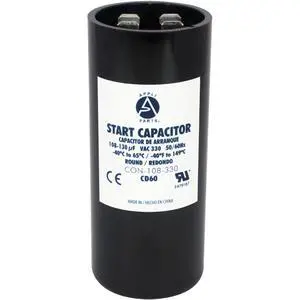 Appli Parts motor start capacitor 108-130 Mfd (microfarads) uF 330VAC universal fit for electric motor applications 1-7/16 in Wide 3-3/8 in Height CON-108-330