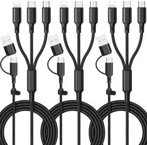 6 in 1 Multi Charging Cable [3Pack 4FT] Nylon Braided Multi Fast Charging Cord USB A/C to Phone USB C/Micro USB/i-P Connector Universal Multiple Phone Charger Cable for Cell Phones