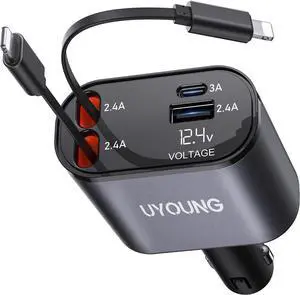 SPGUARD Retractable Car Charger, Fast Car iPhone Charger 60W, 2 Retractable Phone Charger Cables and USB Car Charger, Compatible with iPhone 14/13/12/11