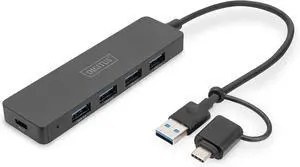 DIGITUS USB Hub - 4 Ports - USB 3.0-4X USB-A - 1x USB-C Power Connection - up to 5 Gbit/s - Includes USB-A to USB-C Adapter - 0.2 m Cable Length - Slim Line - Black