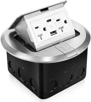 Round Pop Up Floor Outlet Box, Waterproof Electrical Outlet Cover with Soft Close, 4.8A USB+20A Tamper-Resistant Receptacle Floor Electrical Outlet for Kitchen, Office, Desk & Countertop (Silver)