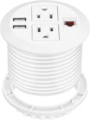 Power Grommet 3 Inch for Desktop, Recessed Desk Outlet with 2USB, 2 AC, 1 Network RJ45 Port & 10Ft Cord, Flush Mount Power Strip Table Power Hub for Countertop, Office, Furniture(White)