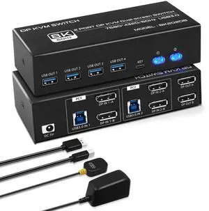 8K DP KVM Switch 2 PC 2 Monitor, Dual Monitor KVM with 4 DP and 2 USB Cables, 4K@120Hz 8K@60Hz Displayport 1.4 and USB 3.0