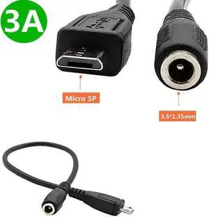 DC Power Jack Female 3.5x1.35mm to USB Micro / mini 5Pin Male 3A 22AWG copper Cable 20cm